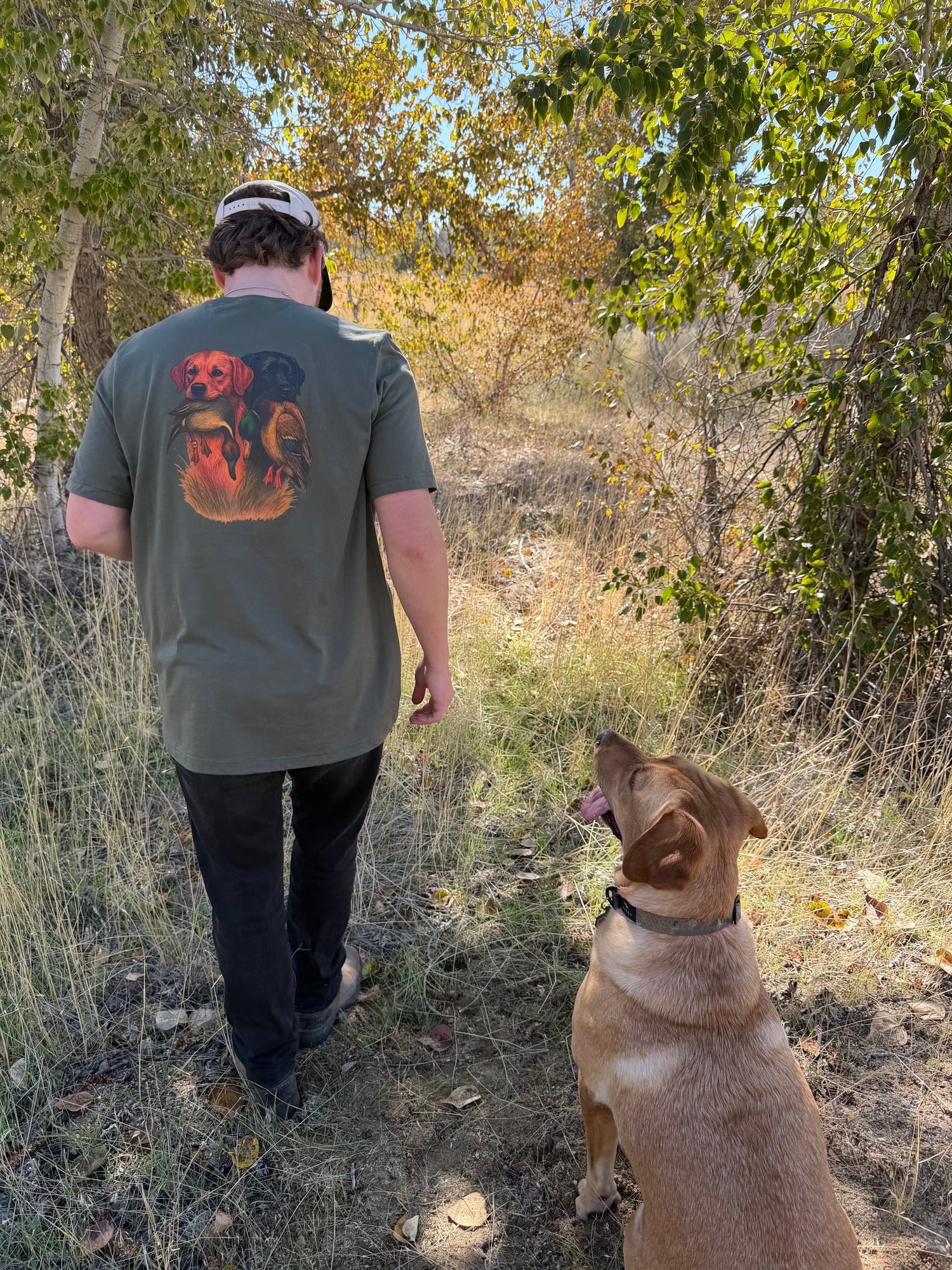 Inspired by Ranger, my 1.5-year-old red lab and loyal hunting companion. Whether he's charging through tall grass or waiting patiently in the blind, Ranger embodies the spirit of the hunt—focused, fearless, and always ready. This collection celebrates that same energy, built for those who live for crisp mornings, muddy boots, and the bond between hunter and dog. Ranger was just as fired up about the design as he is for this season’s first retrieve.